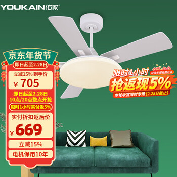 佑家LED餐厅风扇灯吊扇灯现代简约客厅吊灯风扇卧室电扇灯 哑光白 配壁控(两火一零) 48寸