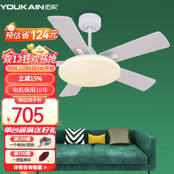 佑家LED餐厅风扇灯吊扇灯现代简约客厅吊灯风扇卧室电扇灯 哑光白 配壁控(两火一零) 48寸