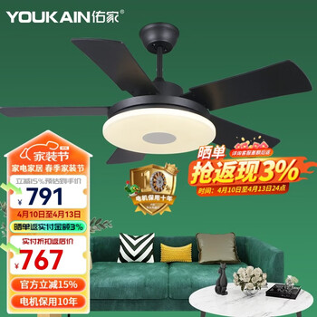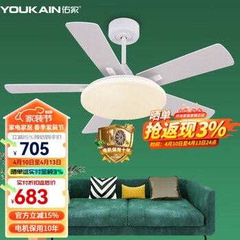 佑家LED餐厅风扇灯吊扇灯现代简约客厅吊灯风扇卧室电扇灯 哑光白 配壁控(两火一零) 48寸